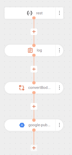 The following flow publishes a message to the topic-01 topic in Google Pub/Sub. The message will be sent in the payload of a REST trigger.